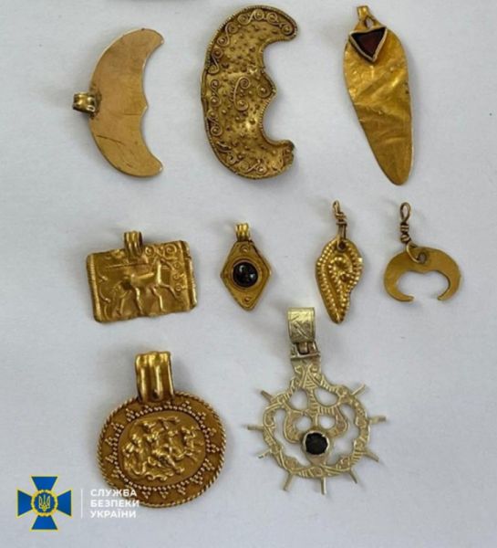 Оперативники и следователи СБУ обнаружили в личных вещах курьера скрытые от таможенного контроля 11 подвесок времен Скифской эпохи, изготовленных из желтого и белого золота.