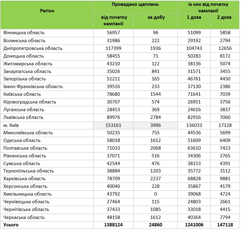 Наибольшее количество прививок сделали в Киеве — 3996, наименьше в Донецкой области — 71. Ни одной прививки не было сделано за прошедшие сутки в Хмельницкой области.