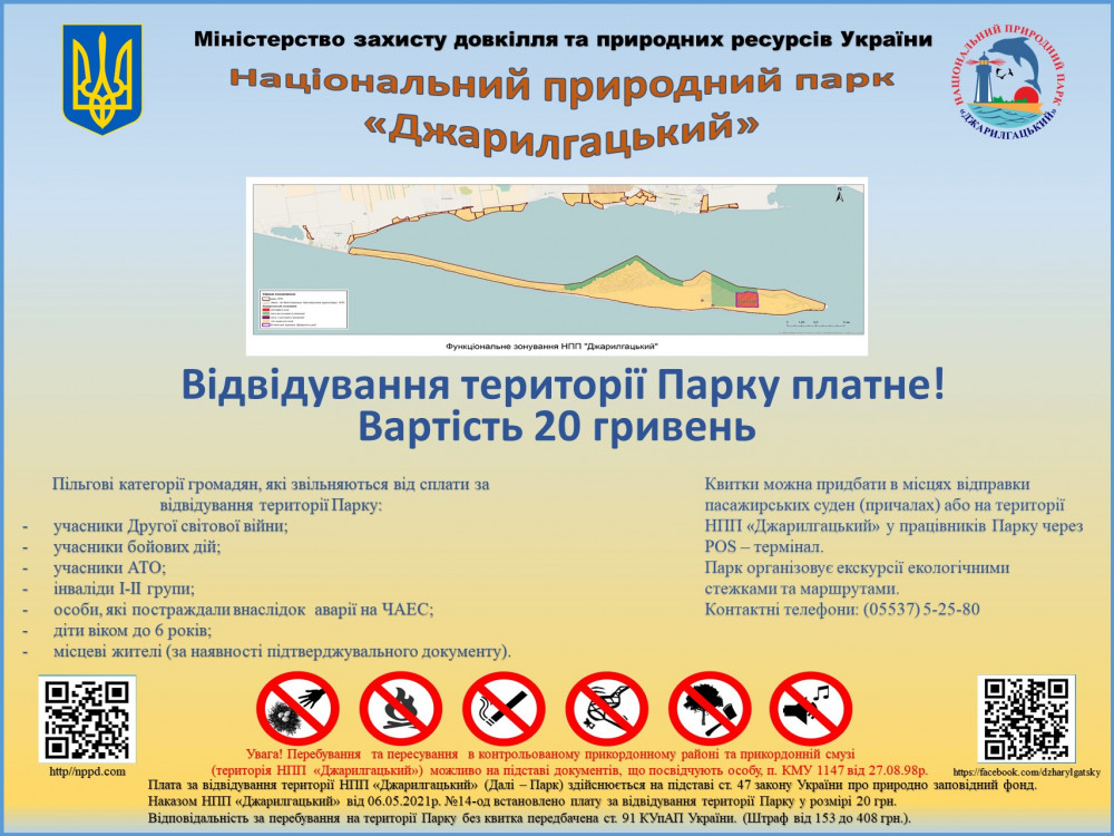 Согласно приказу Министepства защиты окружающей среды и пpиpодно peсуpсов, установлена плата за посещение заповедной территории острова Джарылгач — 20 гривен с человека.