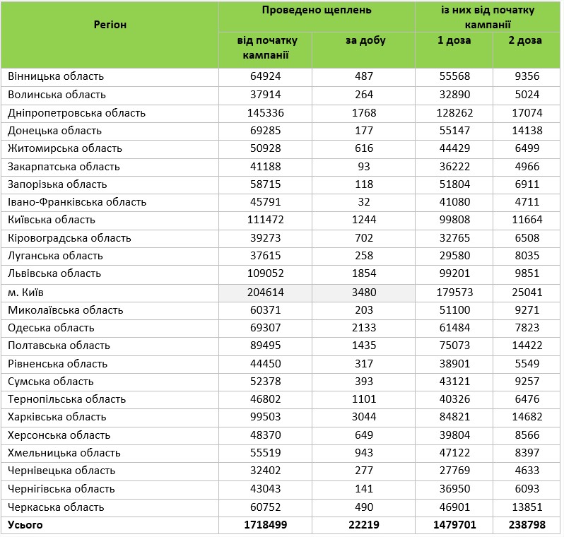 В Украине за последние сутки было вакцинировано от коронавируса 22 219 человек, из них первую дозу получили 20 327 человек, полностью иммунизированы — 1892.