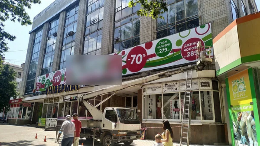 В центре Николаева над универмагом повесили огромную вывеску. Мэрия собирается ее демонтировать