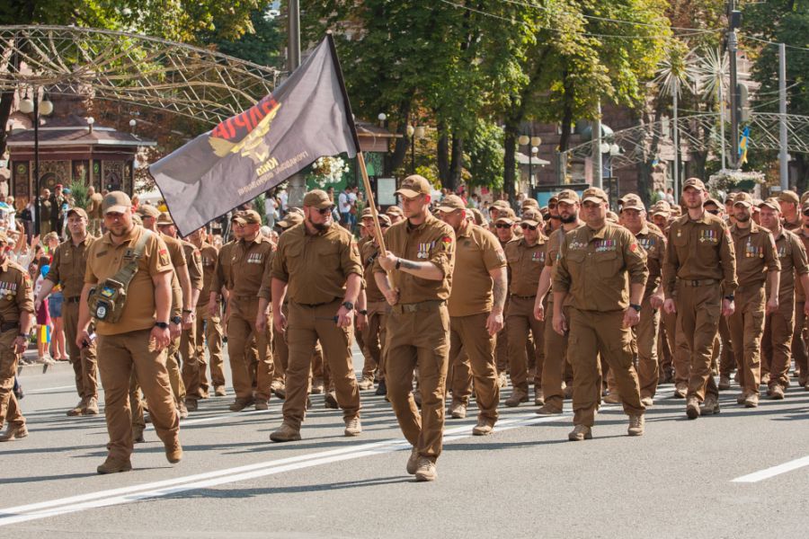 Далее колонна строилась из медиков и капелланов. Ветераны войны шагали в порядке по территориальному принципу. Киевские военнослужащие шли первый, а за ними — защитники Украины из других областей.