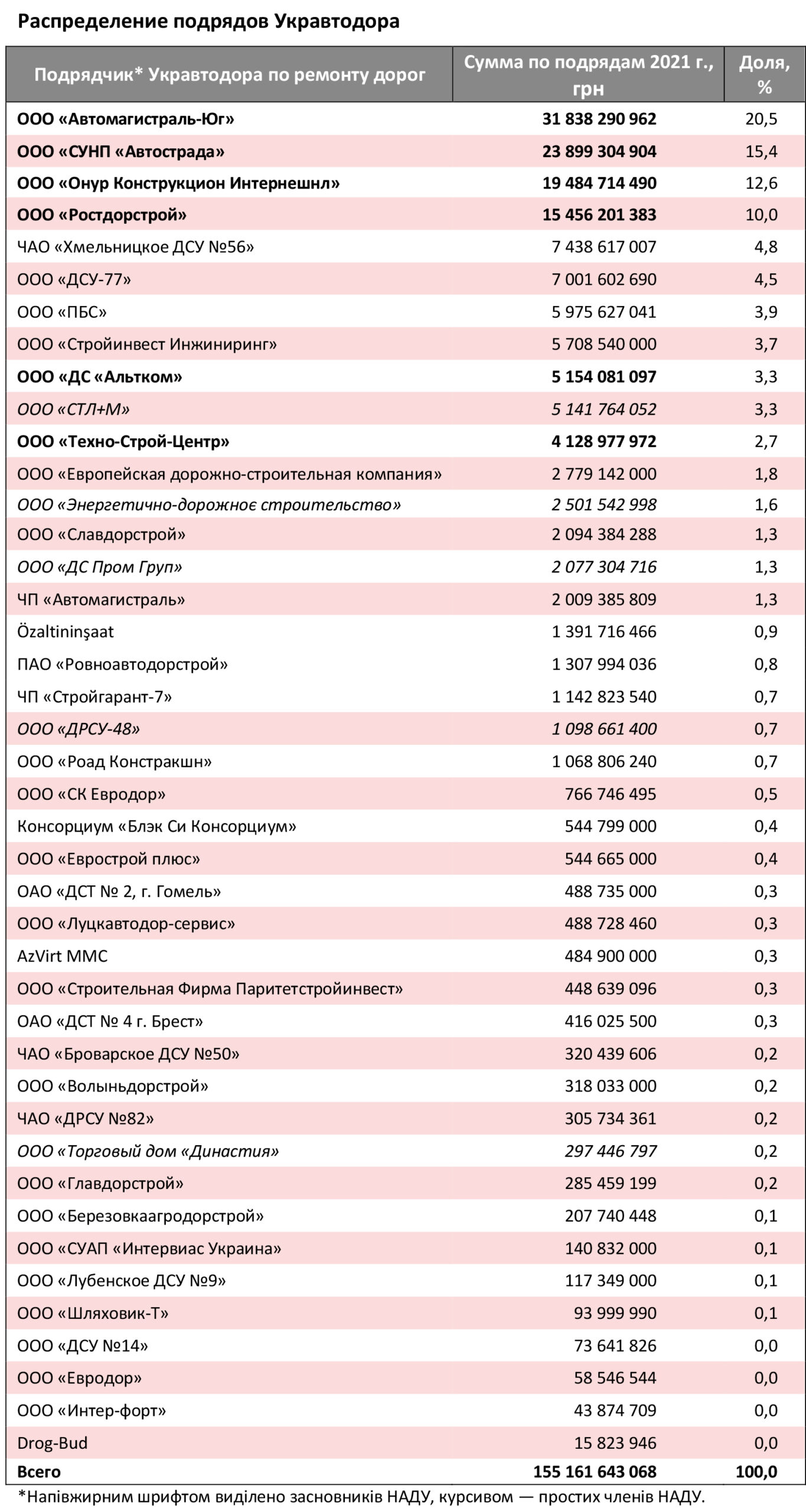 Напомним, раскол среди фаворитов Укравтодора начался этой весной с заявления владельца «Автострады» Максима Шкиля о выходе из Национальной ассоциации дорожников Украины (НАДУ). Ее в начале «Большого строительства» основали шесть крупных компаний, в отношении которых «Лига антитраста» подавала заявление в АМКУ с перечнем признаков картельного сговора. Через полтора года этот картель дал трещину, и «Автострада» этим летом начала все реже пересекаться с «Автомагистралью-Юг» и «Онуром».