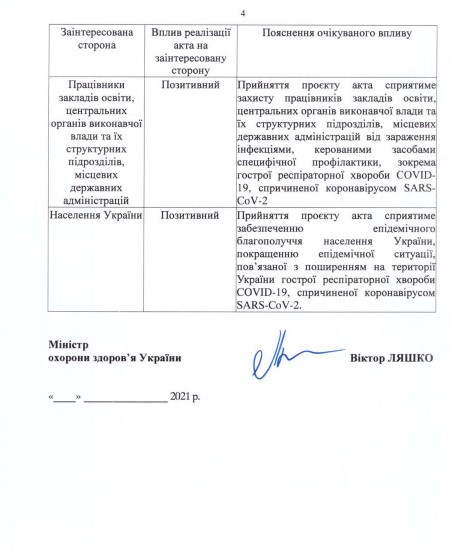 Документ предусматривает утверждение перечня профессий, производств и организаций, работники которых подлежат обязательным профилактическим прививкам, предусмотрев включение вакцинации от коронавируса на период действия карантина, установленного правительством, для работников центральных органов исполнительной власти и их территориальных подразделений; работников местных государственных администраций; работников учреждений профессионального (профессионально-технического образования), профессионального предвысшего, общего среднего образования, дошкольного образования, внешкольных учебных заведений.