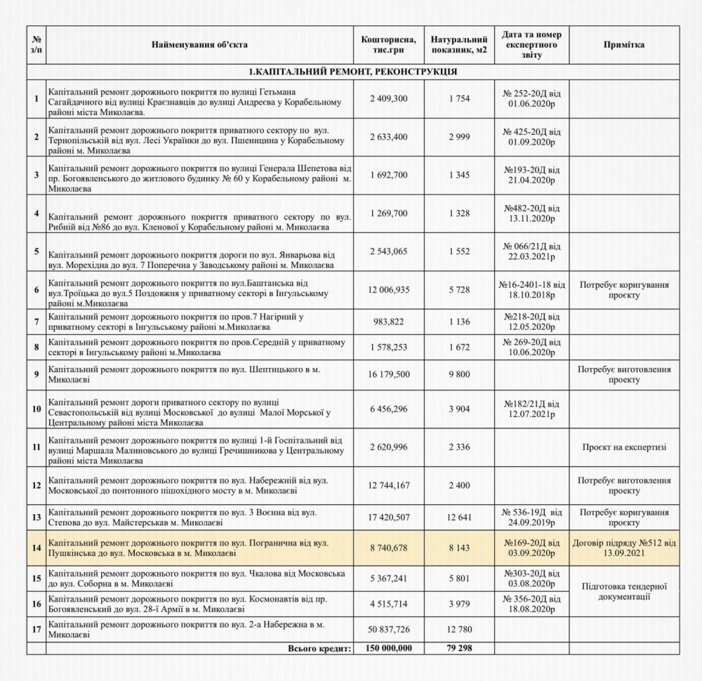 В частности, за кредитные средства в Николаеве капитально отремонтируют 17 дорог. Наибольшую сумму направят на дорогу по улице 2-я Набережная – её капитальный ремонт обойдется в 50 миллионов 837 тысяч гривен. Еще 17 миллионов 420 тысяч гривен потратят на ремонт дороги по улице 3-я Военная, от улицы Степовая до улицы Мастерская; 16 миллионов 179 тысяч гривен – на ремонт дороги по улице Шептицкого; 12 миллионов 744 тысячи гривен – на ремонт улицы Набережная, от улицы Московская до пешеходного понтонного моста и ещё 12 миллионов 6 тысяч гривен потратят на ремонт дороги по улице Баштанская, от улицы Троицкая до улицы 5-я Поперечная в частном секторе Ингульского района.