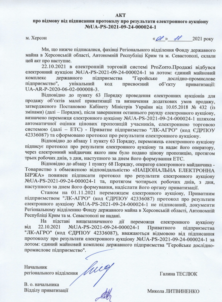 "Геройское опытно-промышленное предприятие" Фонд госимущества снова выставил на торги. Компания ЧП "Лк-агро", выигравшая аукцион по продаже единого имущественного комплекса государственного предприятия, предложив за него 45 млн гривен, отказалась от покупки.