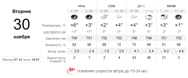 Прогноз погоды на вторник, 30 ноября