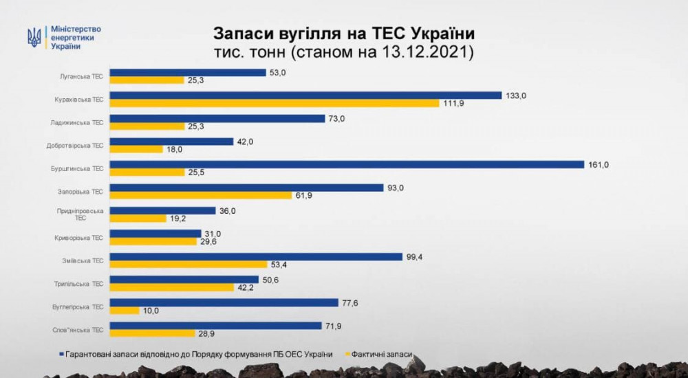 При этом суточные расходы угля превышают поставки на таких ТЭС: Славянской, Углегорской (государственной "Центрэнерго"), Трипольской (Центрэнерго), Змиевской (Центрэнерго), Бурштынской (ДТЭК Рината Ахметова) и Луганской (ДТЭК) теплоэлектростанциях.