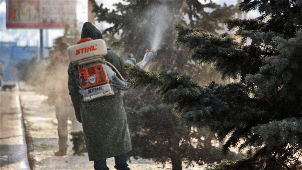 В городе Таврийск Херсонской области декоративные елки, растущие в парках, скверах и на улицах, коммунальщики обрызгивают жидкостью, которая при комнатной температуре начинает нестерпимо вонять.