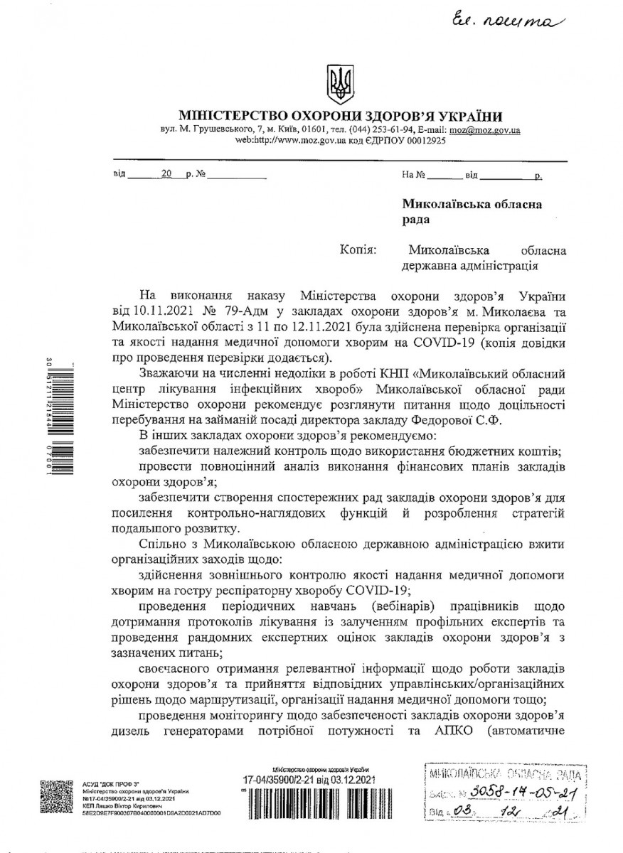 Отметим, что накануне министр здравоохранения Украины Виктор Ляшко рекомендовал Николаевской ОГА рассмотреть вопрос о целесообразности пребывания Светланы Федоровой на посту директора КНП «Николаевский областной центр лечения инфекционных заболеваний».