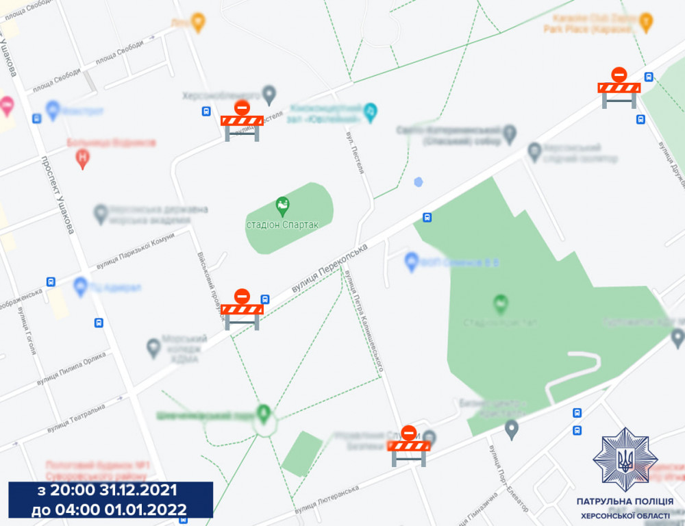 Движение будут перекрывать по ул. Перекопской (от пер. Военного до ул. Дружбы) и по ул. Пестеля (от 295-й Херсонской стрелковой дивизии в ККЗ «Юбилейный») с 20:00 31 декабря до 04:00 1 января.