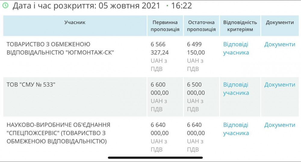 В ноябре провели повторные открытые торги, в которых победило ООО “СМУ №433”. Компания предложила на этот раз 6,57 млн грн за работу. Предложение конкурента – ООО “НПО “Спецпожсервис” – за 6,54 млн отклонили из-за того, что фирма не предоставила банковские гарантии.