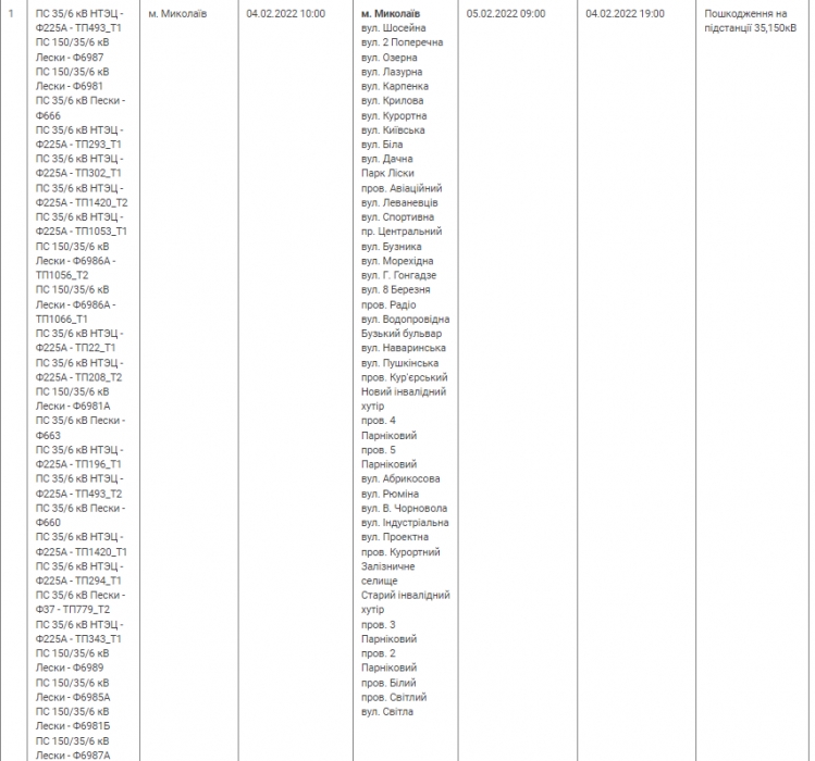 На сайте «Николаевоблэнерго» указаны улицы, которые остались без электроснабжения.