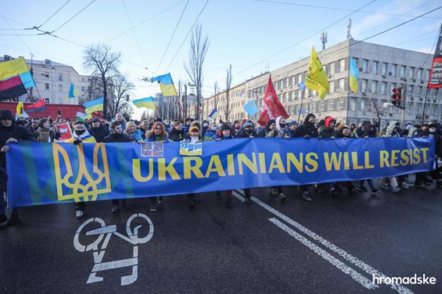 Движение людей происходило в колонне. Люди в первых рядах несли транспарант с надписью «Ukrainians will resist» («Украинцы будут сопротивляться»).