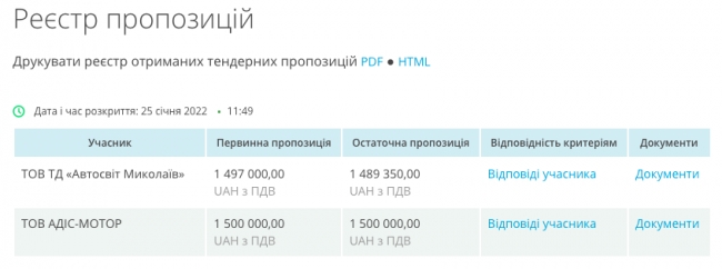В торгах на покупку минивэна приняли участие две фирмы: «Торговый дом «Автомир Николаев» с предложением в 1 млн 489 тыс. 350 грн и «Адис-Мотор» с предложением в 1 млн 500 тыс. грн.