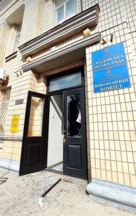 Вражеская техника с буквой Z заехала в Скадовск со стороны Херсона и заблокировала въезд и выезд из города. После этого оккупанты разбили дверь в здании Скадовского горсовета и зашли внутрь.