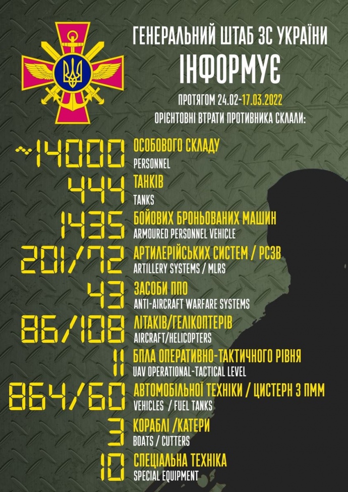 Общие боевые потери противника с 24.02 по 17.03 ориентировочно составили: