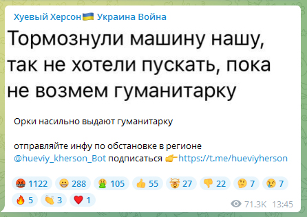 По словам херсонца, автомобиль которго был остановлен на блокпосту, его не хотели отпускать пока он не взял «гуманитарку».