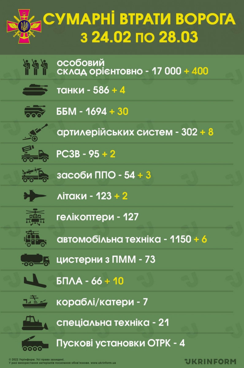 Общие боевые потери противника с 24.02 по 28.03 ориентировочно составили: