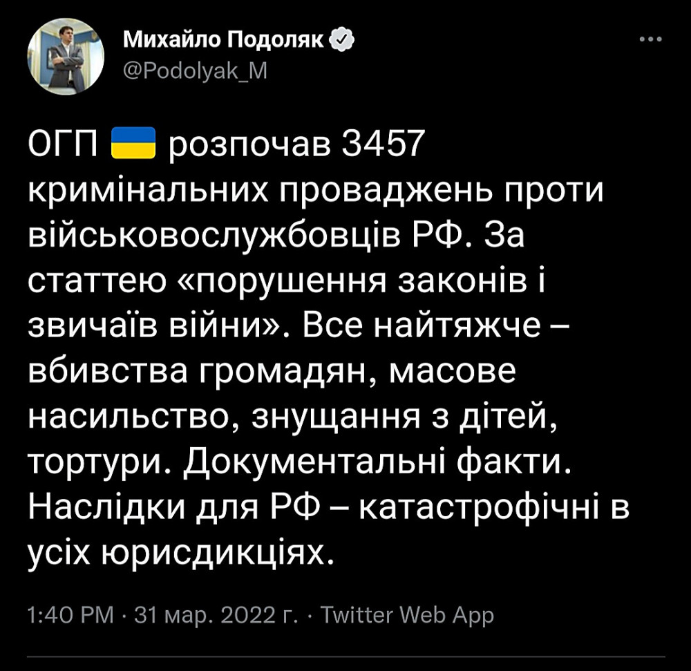 "Все самое тяжелое — убийства людей, массовое насилие, издевательства над детьми, пытки. Документальные факты. Последствия для РФ — катастрофические во всех юрисдикциях", — написал Подоляк.