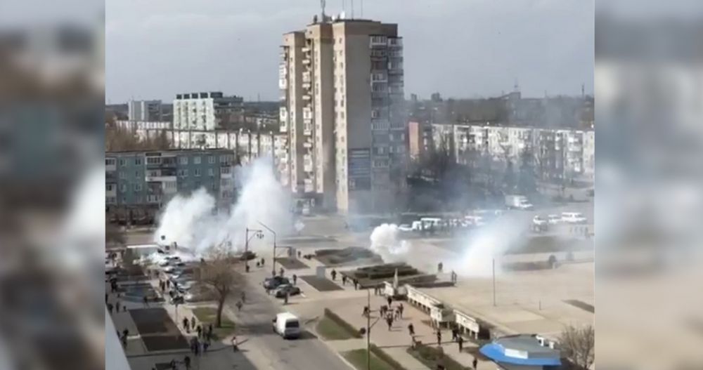 В субботу утром жители города собрались на мирный митинг в поддержку Украины. Они пели гимн и разговаривали. За этим наблюдали оккупанты.