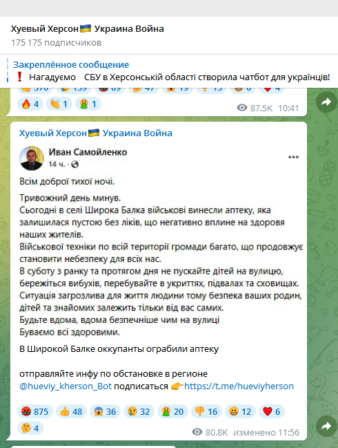 Инцидент в Томиной Балке – не первый случай разграбления российскими оккупантами аптек в населенных пунктах Херсонской области. О подобных инцидентах также рассказывали жители Берислава, населенных пунктов Каховского района, других населенных пунктов Херсонской области.