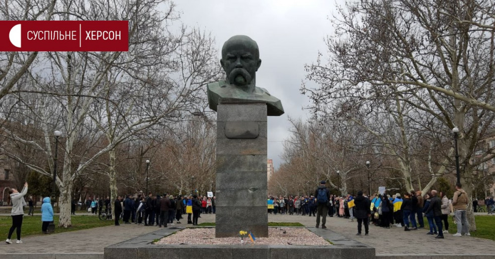В Херсоне люди пришли к памятнику Шевченко с украинской символикой и плакатами с надписями «Херсон – это Украина!». Они скандируют: «Слава Украине! Героям Слава!», «Слава нации! Смерть врагам!» и «Слава воинам ВСУ!».