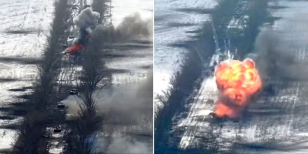 На нем видно колонну из около десятка единиц бронетехники, которая во время своего продвижения попала под огонь украинской артиллерии.