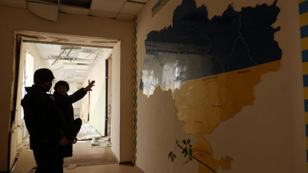 Коридоры учебного заведения усеяны осколками, с потолков свисает штукатурка. На стене висит практически нетронутая карта Украины.