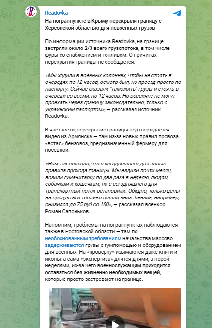 Российские пограничники и таможенники ввели некий «особый порядок» пропуска грузов с одной оккупированной россией территории на другую оккупированную россией территорию, сообщает российский Telegram-канал Readovka, поддерживающий российскую агрессию против Украины.