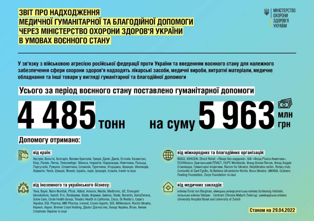 Украинские медучреждения активно поддерживает украинский и международный бизнес. За два месяца войны гуманитарные грузы поступили от компаний: Teva, Bayer, Novo Nordisk, Pfizer, Abbot, Amarox, Nestle, Medtronic, GE, Emergent biosolutions, Sanofi, Eгиc, Биофарма, Stada, Фармак, Galexis, Novartis, AstraZeneca, Solve Care, Circle Health Group, Teladoc Health in California, Zarys, Dr.Reddy's, Сервье Украина, EQL Pharma, MBI Pharma, Iromed, Crown Agents, SOL-Millennium, Roche Ukraine, Кернел, Aspen, Bremer Lloyd Holding, Диалог Диагностикс, Бевар Украина, Витан, Амлак Стерилокс Украина, Дарница.