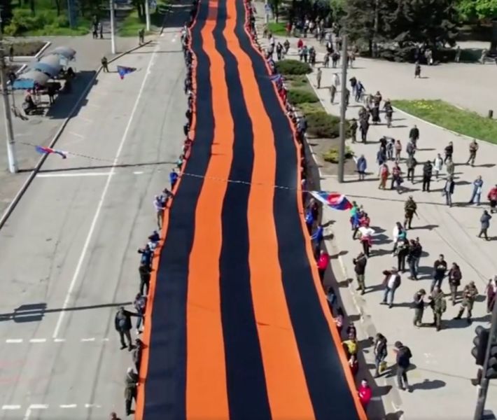 Оккупанты во главе с главарем боевиков «ДНР» Денисом Пушилиным пронесли по одной из улиц города полотно в цветах георгиевской ленты.