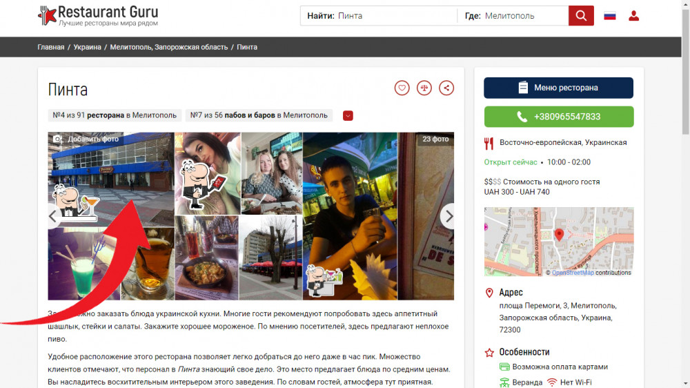 Фото этого заведения можно найти на сайтах с обзорами ресторанов. В Херсоне нет заведения общепита с таким названием и таким дизайном фасада. Кафе "Пинта" существовало в Херсоне до 2020 года, когда было закрыто после множества обращений горожан в контролирующие структуры из-за многочисленных нарушений в работе заведения.