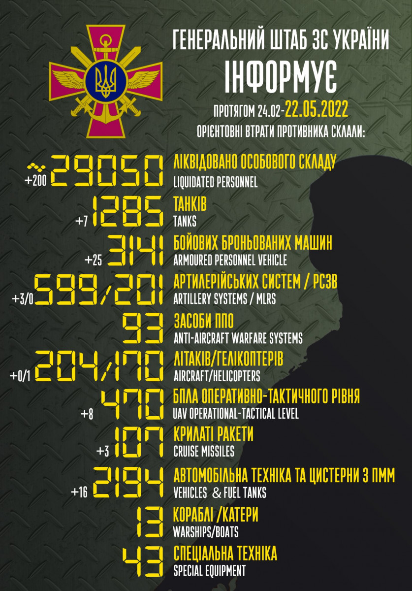 Общие боевые потери противника с 24.02 по 22.05 ориентировочно составили: