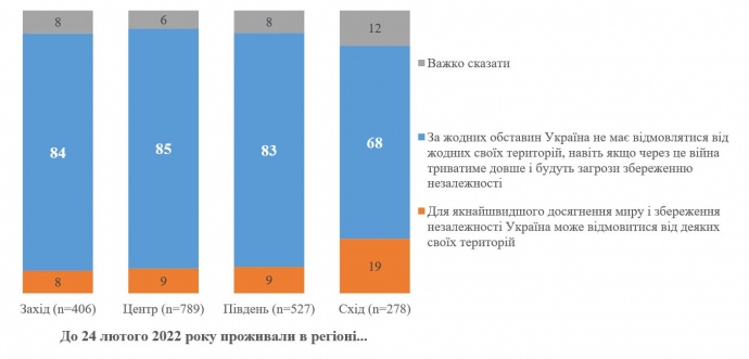 "Для 82% респондентов никакие территориальные уступки не допустимы. Только 10% считают, что для достижения мира и сохранения независимости можно отказаться от некоторых территорий".