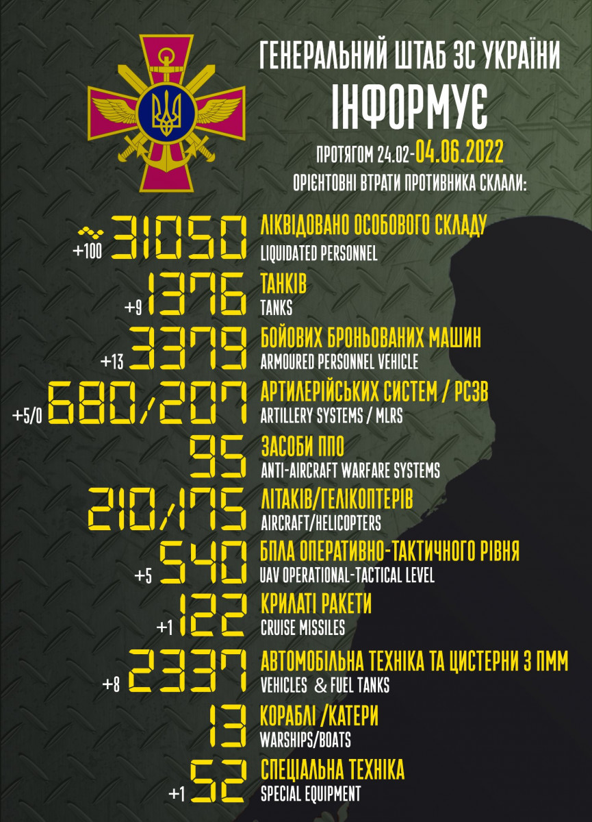 Общие боевые потери противника с 24.02 по 04.06 ориентировочно составили: