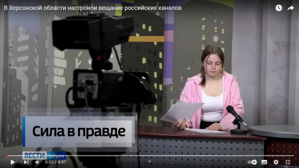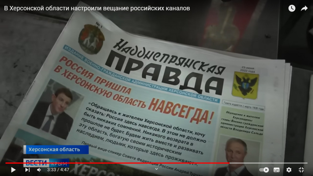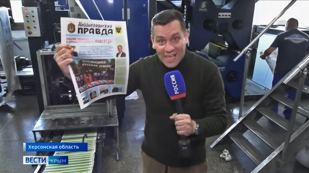 Пропагандистский телеканал «россия» выпустил сюжет о работе в Херсонской области российской «индустрии промывания мозгов»: о начале вещания телеканала «Таврия», одноименно радиостанции и начале выпуска газеты «Надднепрянская правда».