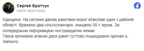 «Поражены два сельхозангара, уничтожено 35 тонн зерна. По предварительной информации, пострадавших нет», — уточнил он.