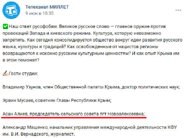 И журналисты обнаружили, что он еще в начале июня появлялся в эфире пророссийского крымскотатарского канала "Миллетт".