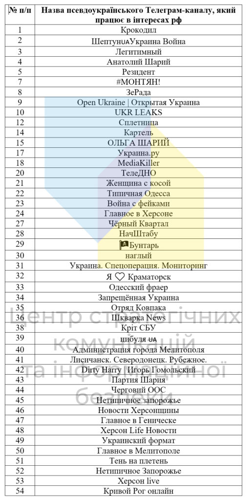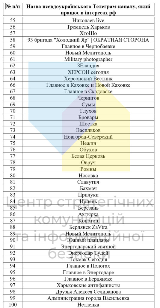 Служба безопасности Украины, Главное управление разведки Минобороны и ряд украинских ведомств обнародовали названия 100 псевдоукраинских Telegram-каналов, работающих на россию.