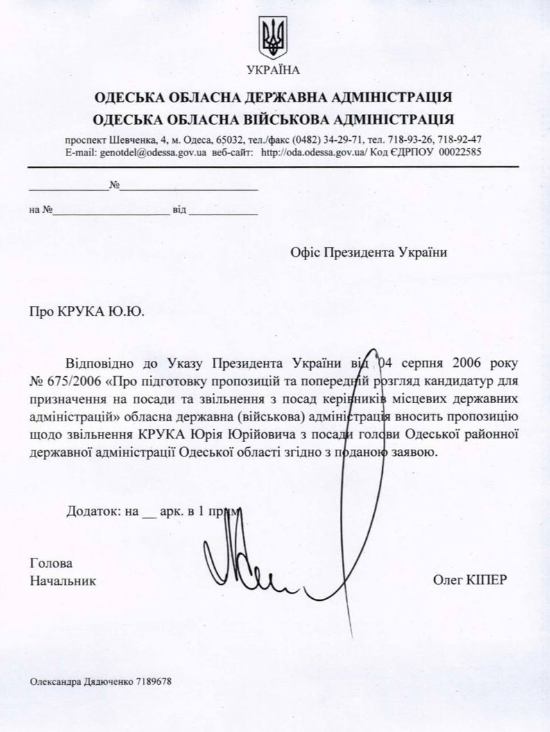 В частности, в соцсетях появился документ о предложении уволить с должности Юрия Крука. Основанием для этого стало поданное заявление должностным лицом.