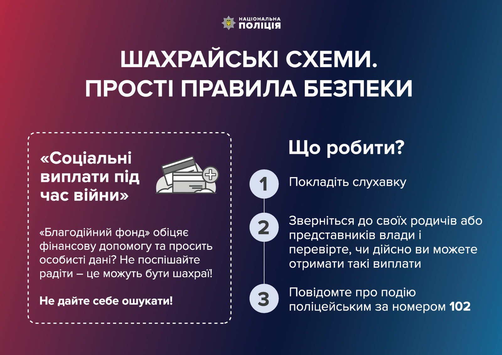 Правоохранители советуют жителям Херсонщины быть чрезвычайно осторожными и критическими к сообщениям, особенно если их авторы предлагают денежные выплаты или требуют предоставления личных данных и банковской информации. Херсонцам советуют никогда не передавать незнакомцам свои личные данные или данные по банковским картам. Также советуют проверять информацию, ее источники и немедленно сообщать в правоохранительные органы о каких-либо подозрительных случаях.
