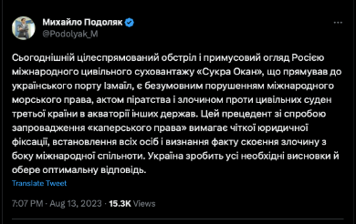 «Сегодняшний целенаправленный обстрел и принудительный осмотр Россией международного гражданского сухогруза «Сукра Окан», который направлялся в украинский порт Измаил, является безусловным нарушением международного морского права, актом пиратства и преступлением против гражданских судов третьей страны в акватории других государств».