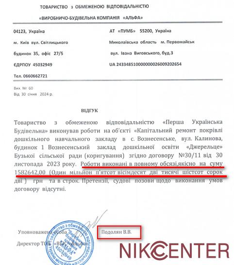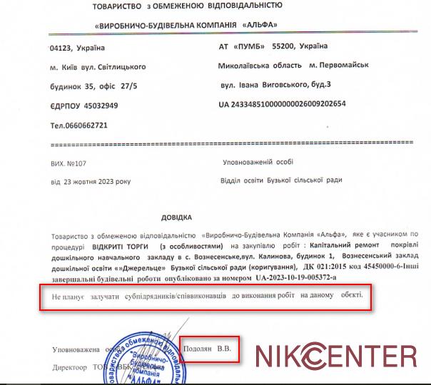 Но во время проверки документации чиновники не заметили другого. На тендере на ремонт детсада в 2023 году, тот же Владимир Подолян подписал другую справку: что не будет привлекать субподрядчиков. Таким образом, или руководитель компании солгал в 2023 году, что собирается выполнить договор собственными силами, или в 2024 году — чтобы завести друзей на рынок госзаказов.