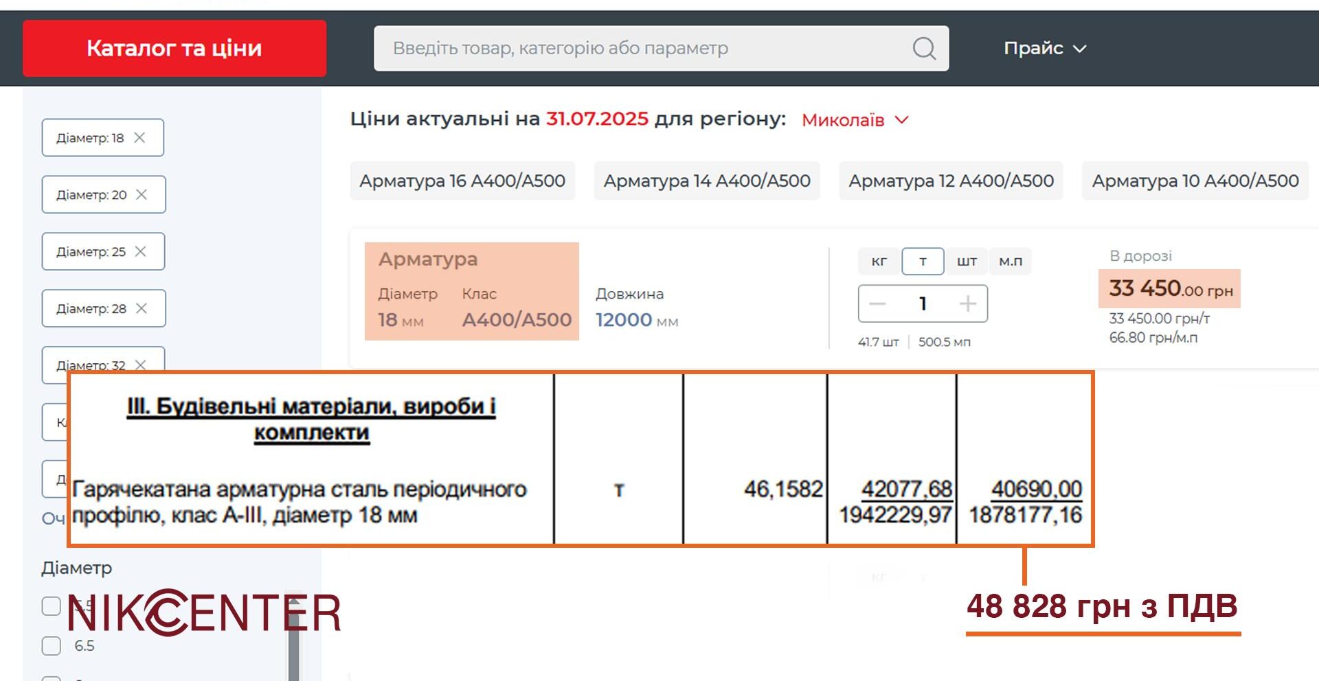 Заметим, что проект DOZORRO зафиксировал в июле 2024 года рыночную цену арматуры класса А-II-III различных диаметров у трех крупных поставщиков по цене 31 864 — 33 500 гривен за тонну.