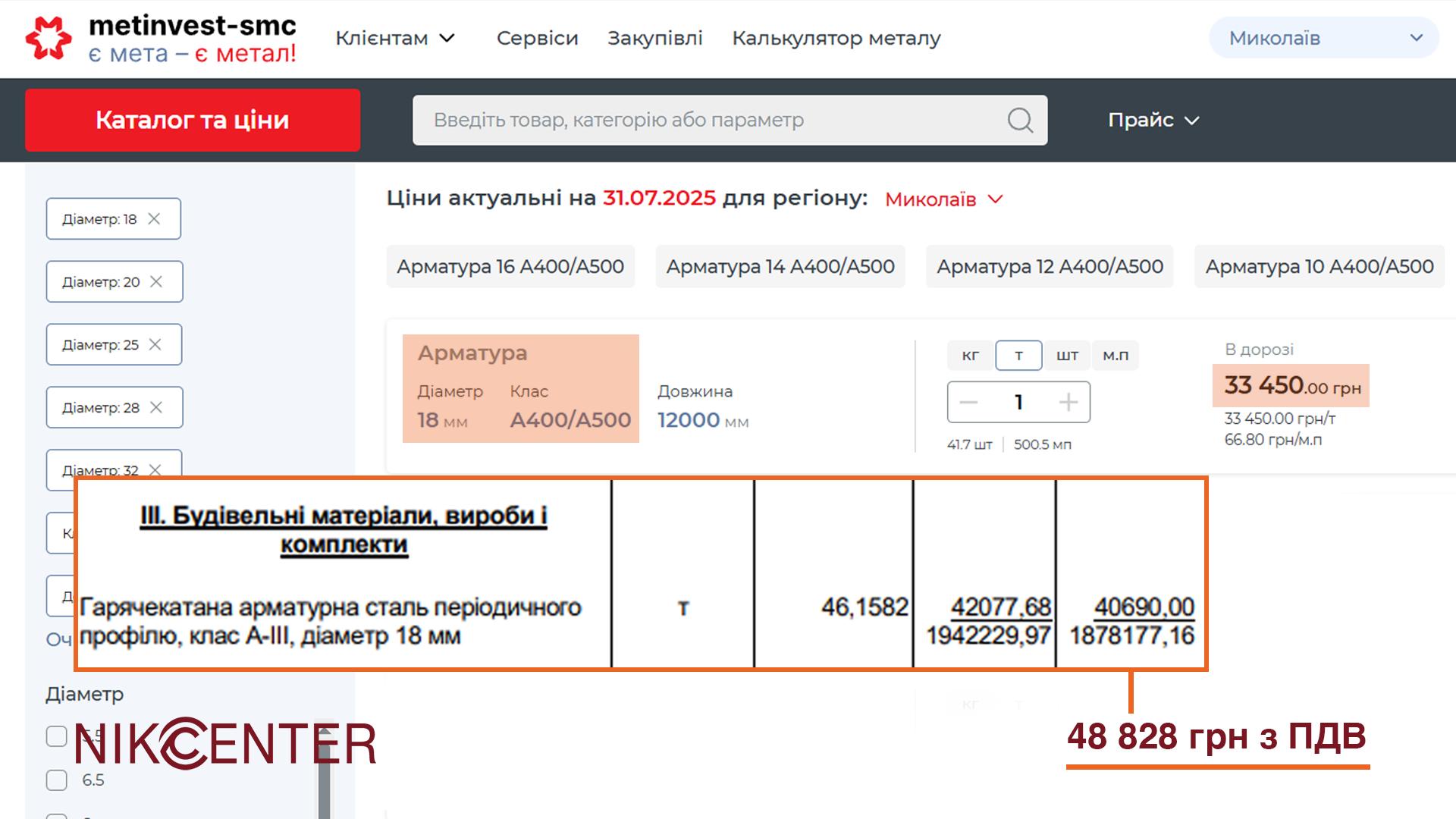 Еще большие переплаты — в сметах укрытия для лицея №4 в Южноукраинске. ПУБ продает здесь арматуру по 46 958,58 — 50 310,18 грн/тонну (все цены указаны с НДС). Тогда как мониторы зафиксировали в декабре на такую арматуру предложения «Метинвест-СМЦ» — 33 500 грн/тонну, Iron World — по 31 849 — 35 389 грн/тонну, а «КТ-Сталь» — по 36 990 — 37 920 грн за тонну.