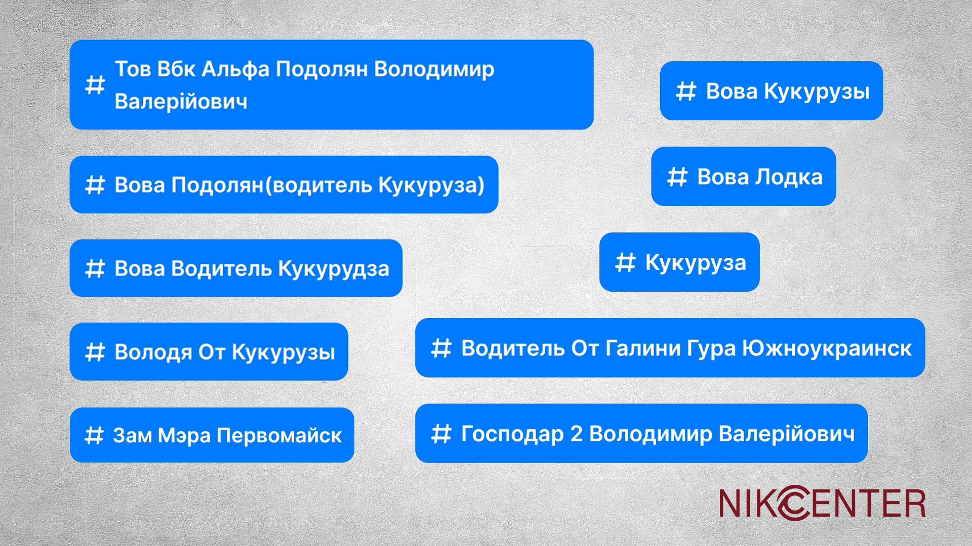 И не менее интересные теги личного номера Подоляна: «водитель Кукурузы», «помощник Кукурузы», «заммера Первомайска», «водитель от Галины Гуры» и десятки подобных.