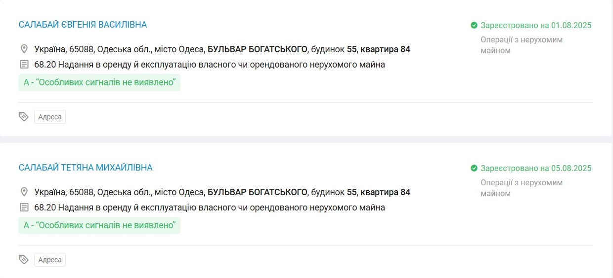 По данным аналитической системы YouControl, по этому же адресу зарегистрированы еще два ФЛП – уже упомянутая Салабай Евгения Васильевна и Салабай Татьяна Михайловна.