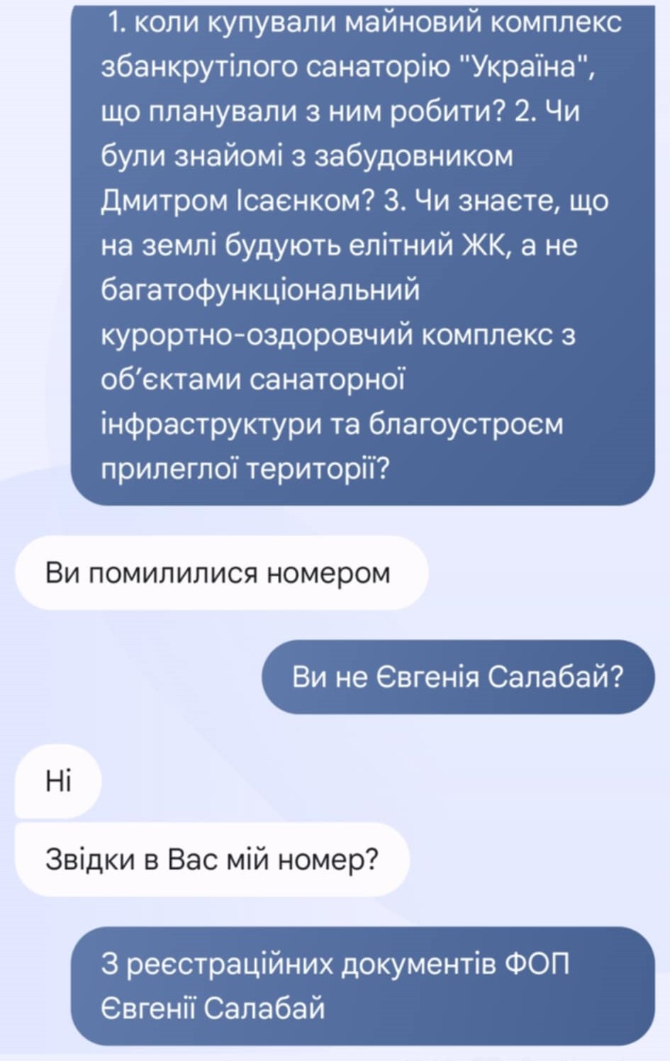Nikcenter обратился к Евгении Салабай, написав сообщение по номеру телефона, указанному в документах регистрации ФЛП. Журналистов интересовало, как вместо многофункционального курортно-оздоровительного комплекса на рекреационной земле «растет» элитный ЖК. Однако по этому телефону журналисту Nikcenter сообщили, что «вы ошиблись номером».