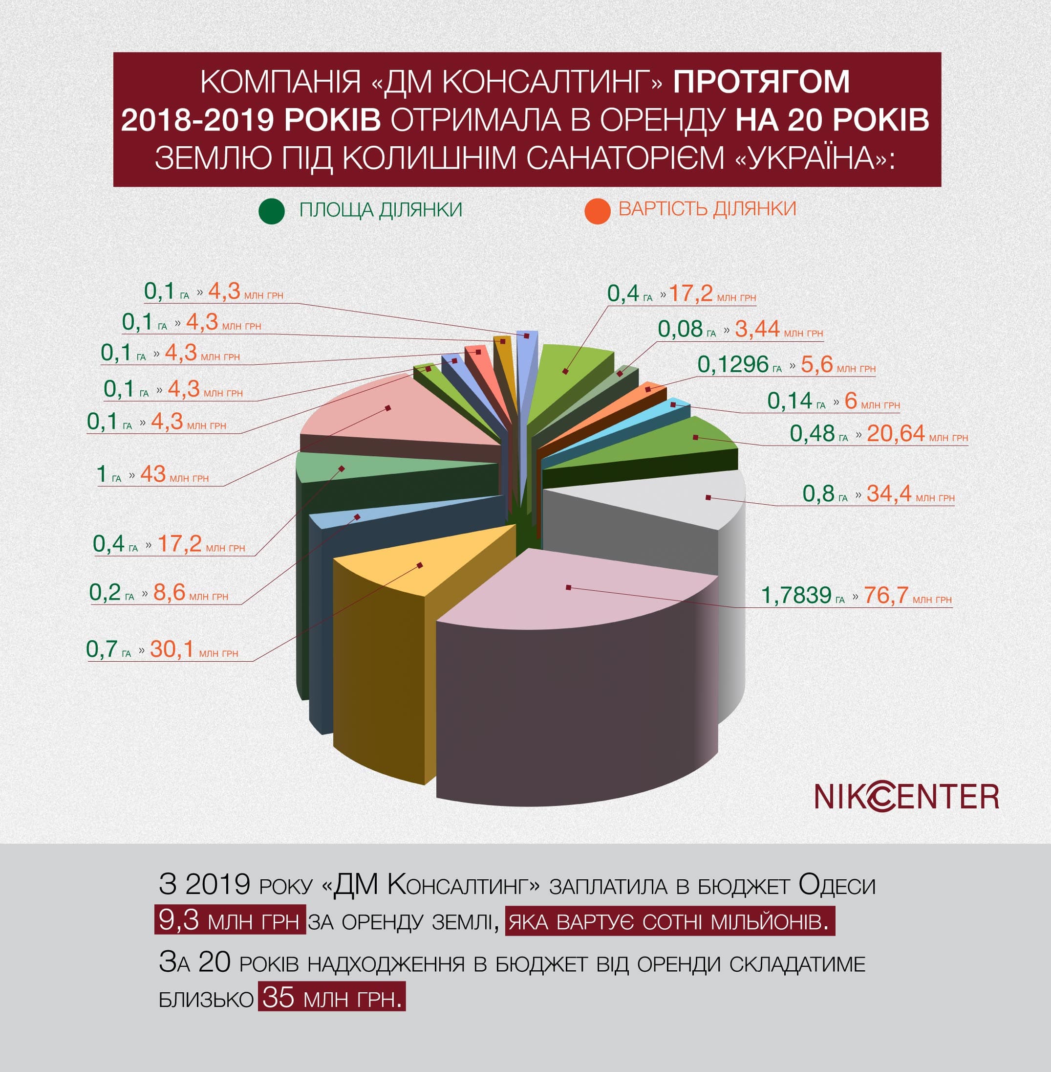 Из информации, предоставленной в департаменте земельных ресурсов Одесского городского совета, известно об аренде компанией «ДМ Консалтинг» 16 земельных участков, на которых когда-то был расположен санаторий «Украина». Общая площадь – более 6,6 гектаров земли, срок аренды которых составляет 20 лет.